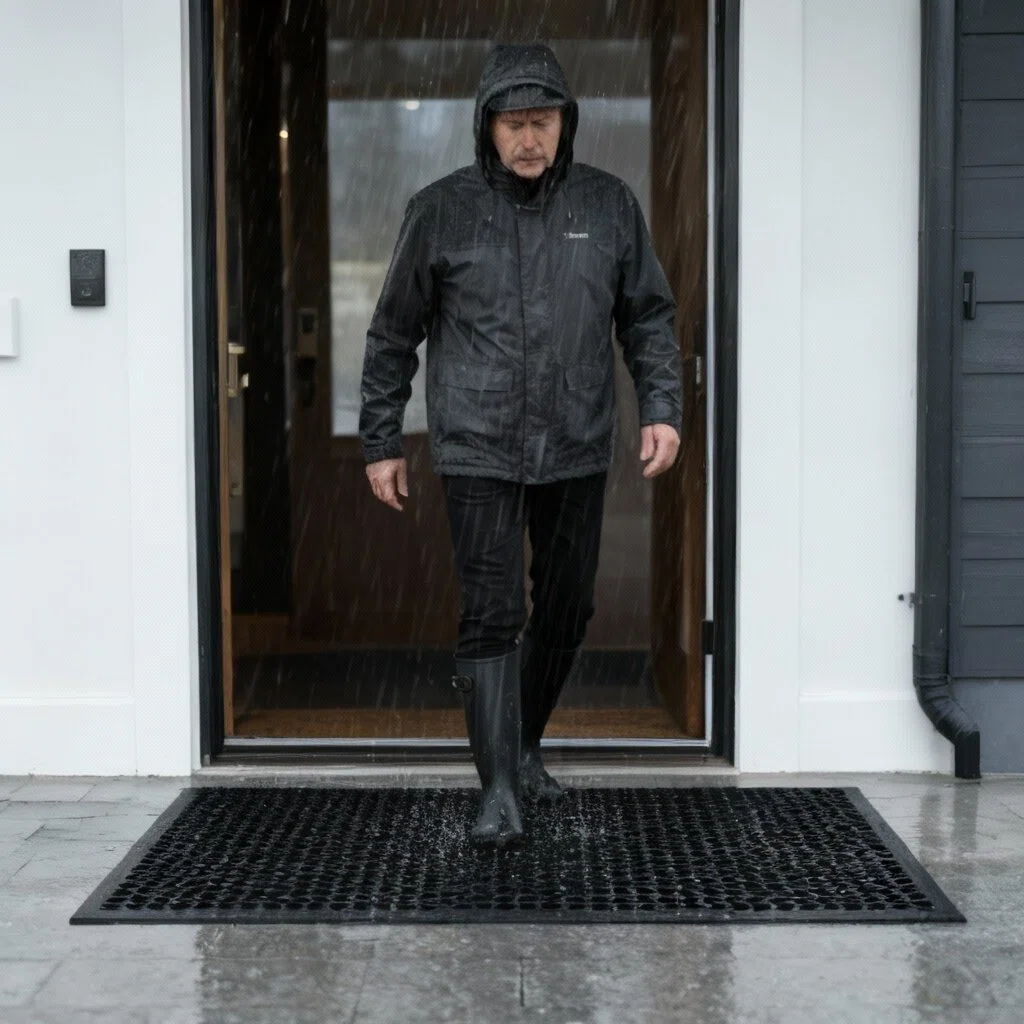 - Easy to Clean: Simply vacuum with a hand-held vacuum, sweep with a broom, or shake off outdoors or over your garbage bin or use a garden hose to rinse the mat outdoors,keep the outdoor rubber mat fully air dry before next use